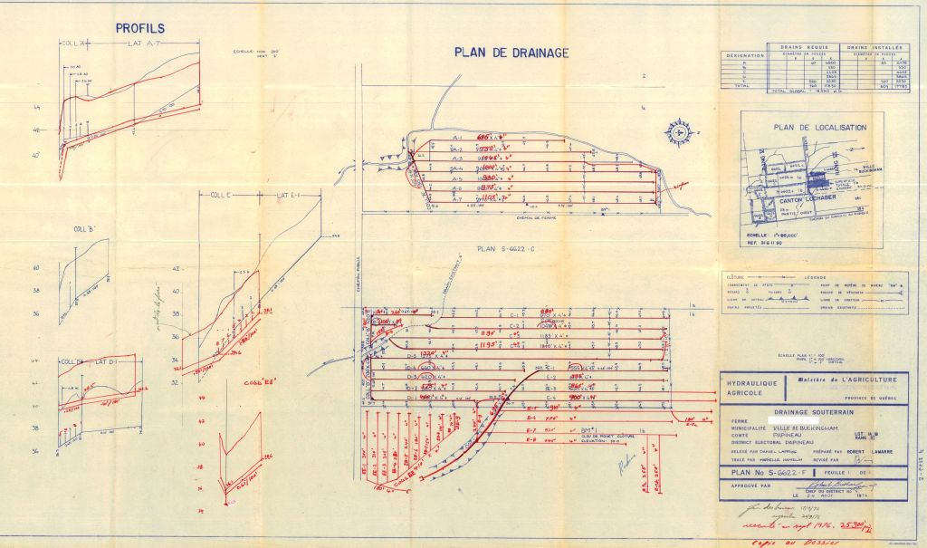 Plan de drainage souterrain annoté pour la municipalité de Buckingham, comté de Papineau. Préparé pour le compte du Ministère de l¿Agriculture du Québec.