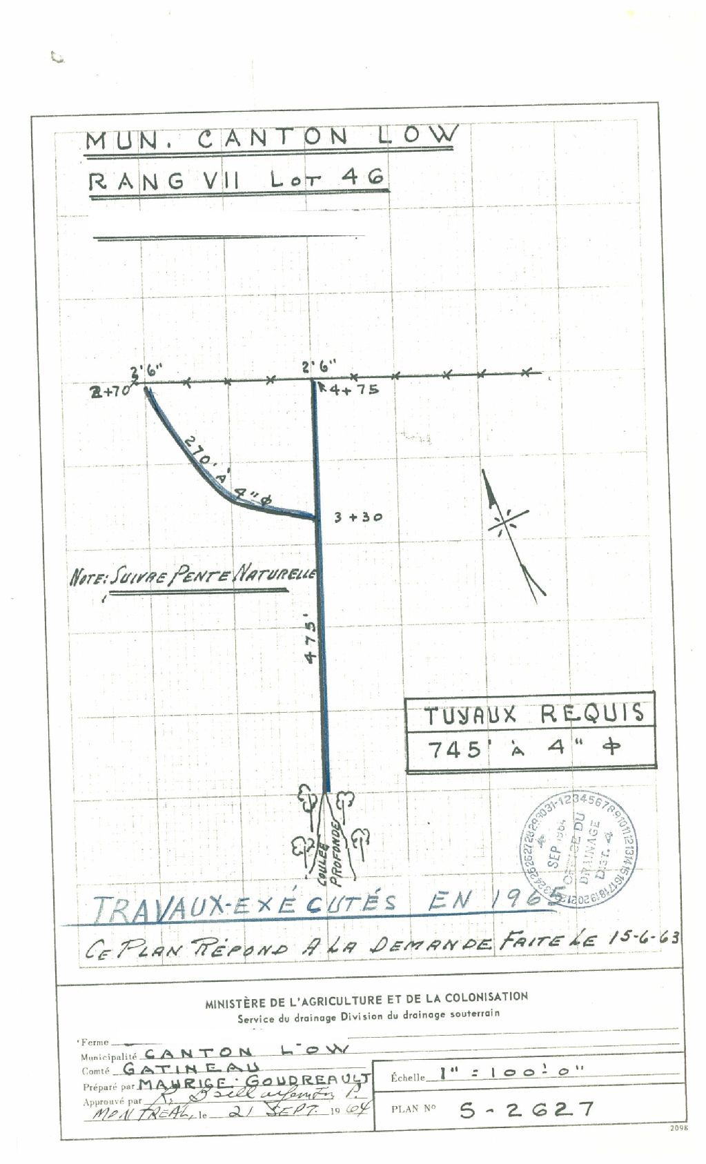 Plan de drainage souterrain annoté pour la municipalité du canton de Low, comté de Gatineau. Préparé pour le compte du Ministère de l¿Agriculture et de la Colonisation du Québec.