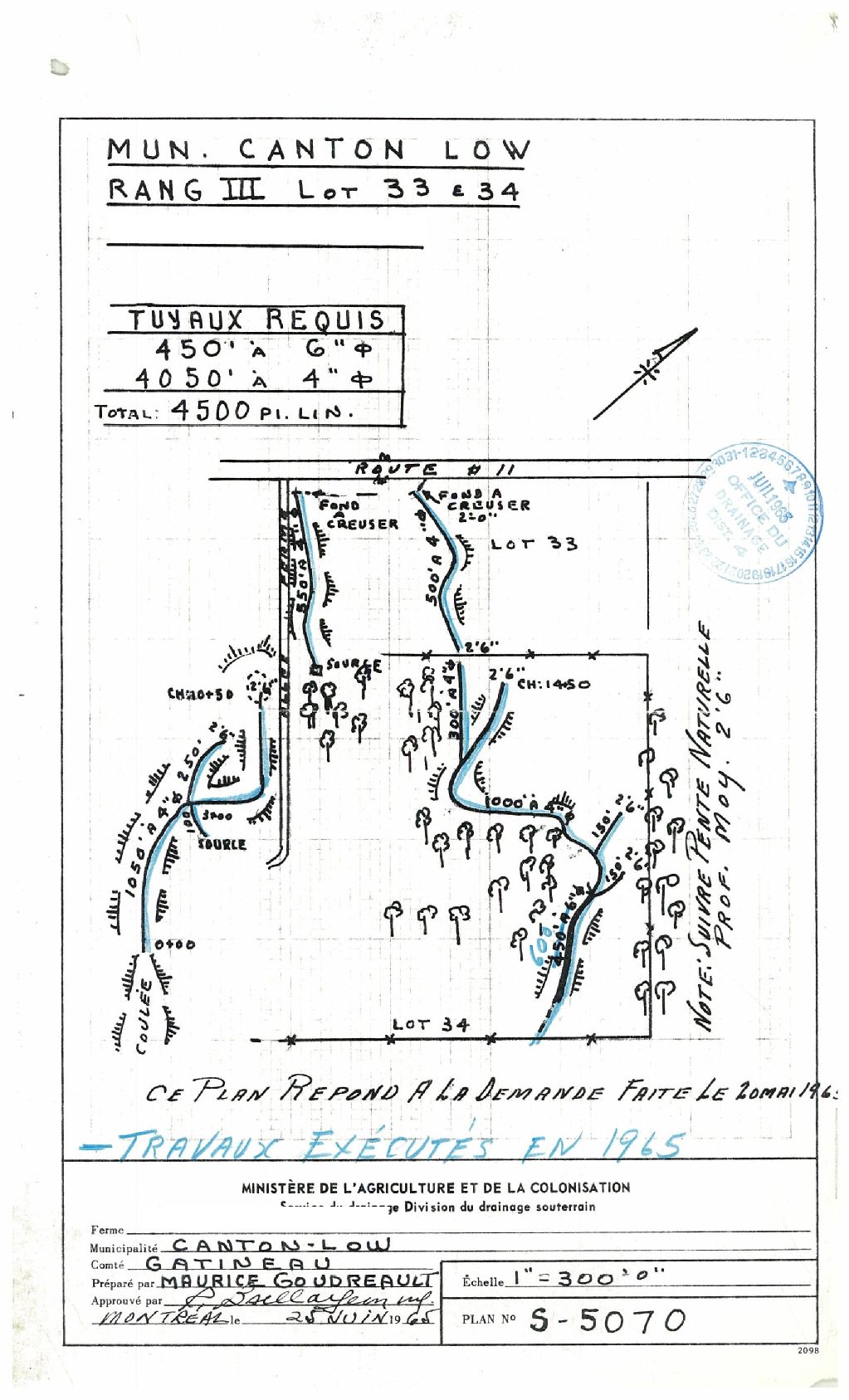 Plan de drainage souterrain annoté pour la municipalité du canton de Low, comté de Gatineau. Préparé pour le compte du Ministère de l¿Agriculture et de la Colonisation du Québec.