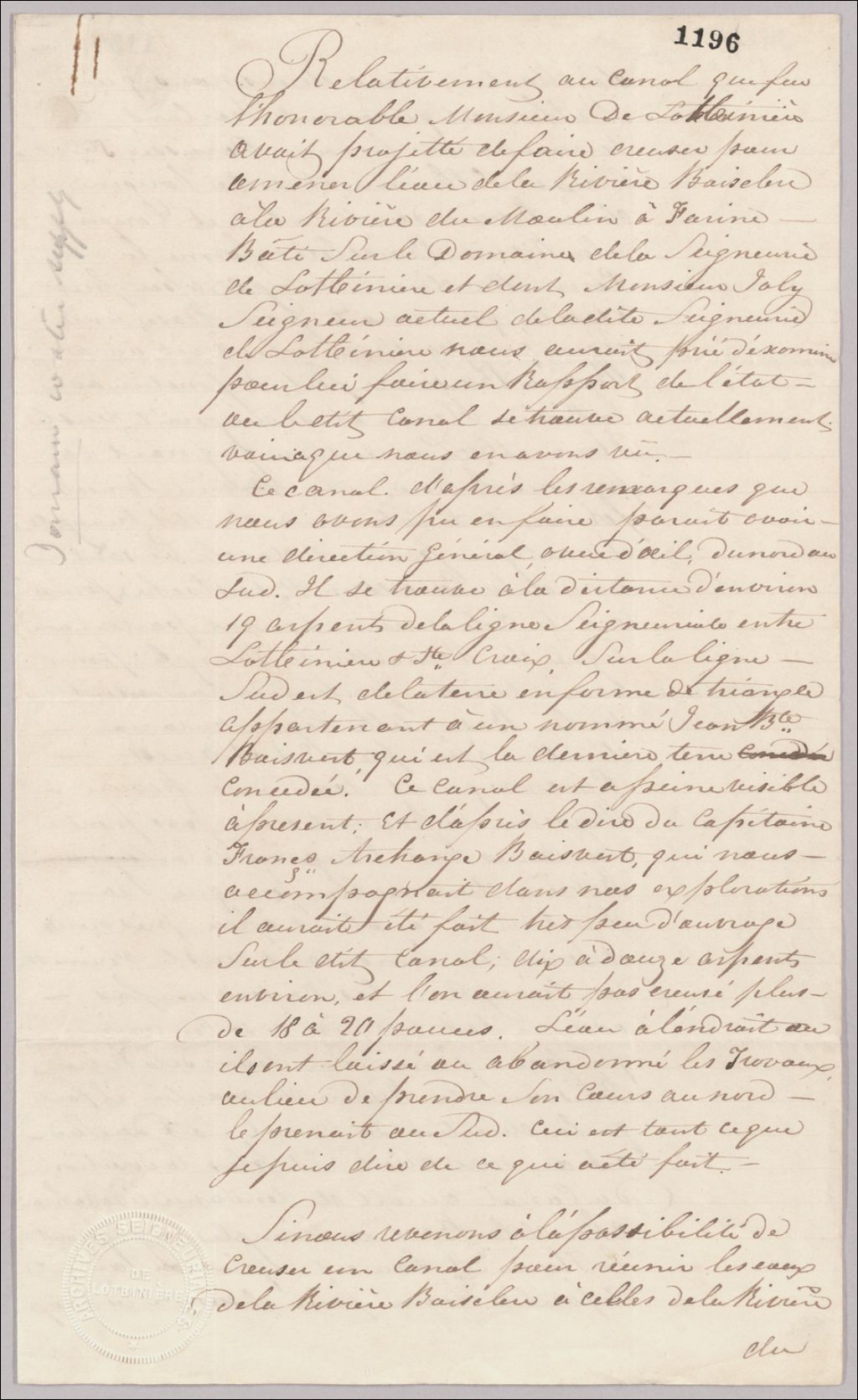 Observations sur le canal commencé dans la savane pour amener l’eau de la rivière Boisclerc à la rivière du moulin à farine, 15 février 1845, Archives nationales à Québec, Fonds Famille Joly de Lotbinière, (03Q,P351,S3,P1196).
