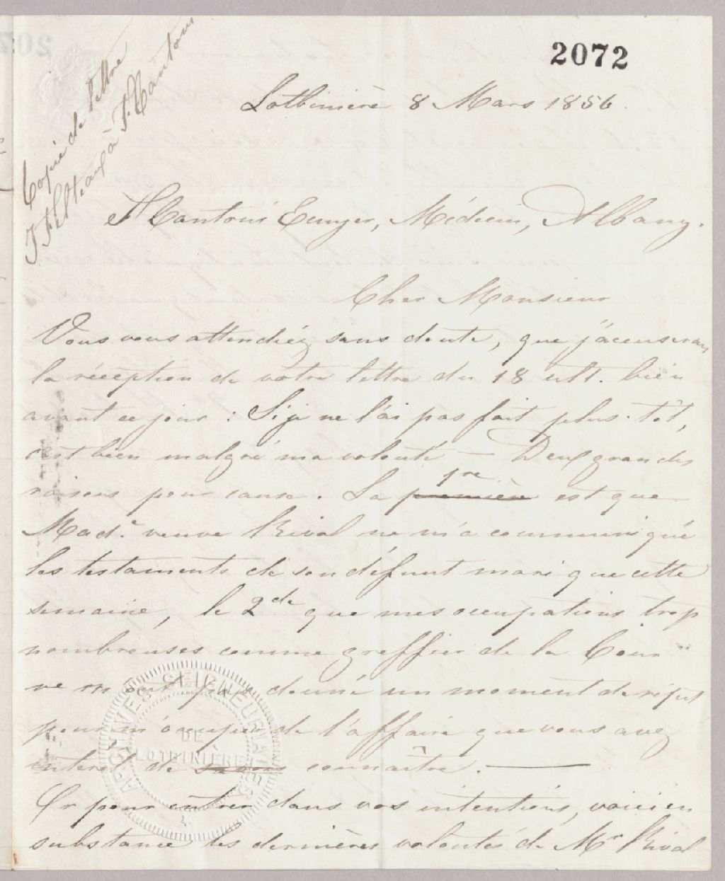 Lettre de Joseph Filteau à Faustino Cantoni, 8 mars 1856, Archives nationales à Québec, Fonds Famille Joly de Lotbinière, (03Q,P351,S3,P2072).