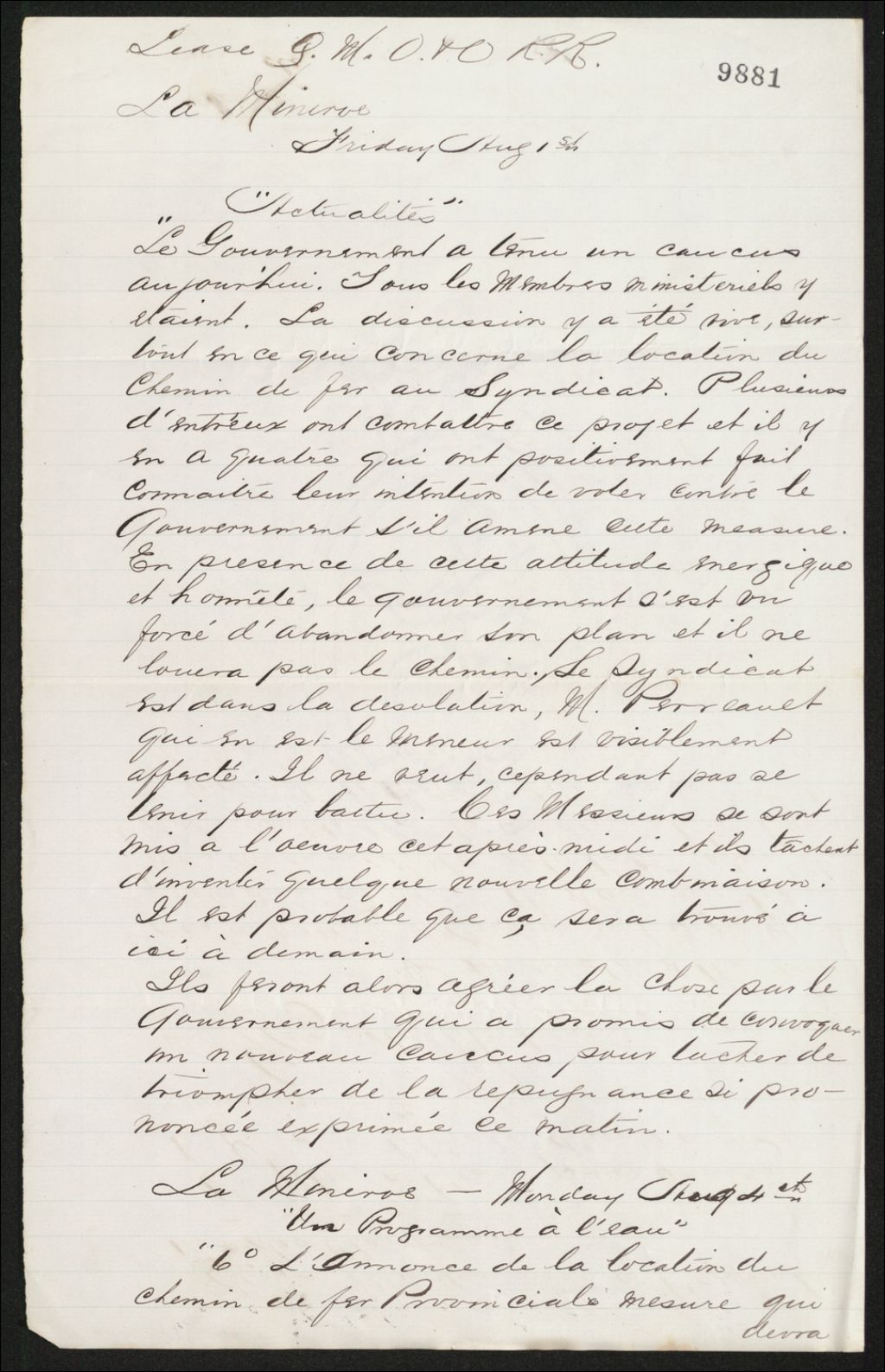 Notes prises dans les journaux conservateurs, vers 1879, Archives nationales à Québec, Fonds Famille Joly de Lotbinière, (03Q,P351,S4,SS2,P9881).