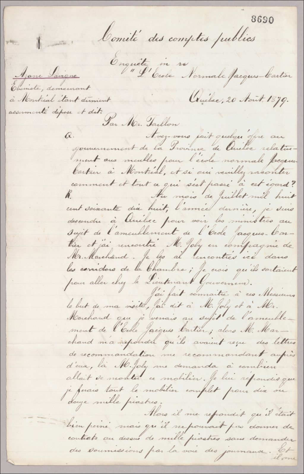 Ameublement de l'école normale Jacques Cartier. Déposition d'A. Lavigne, 20 août 1879