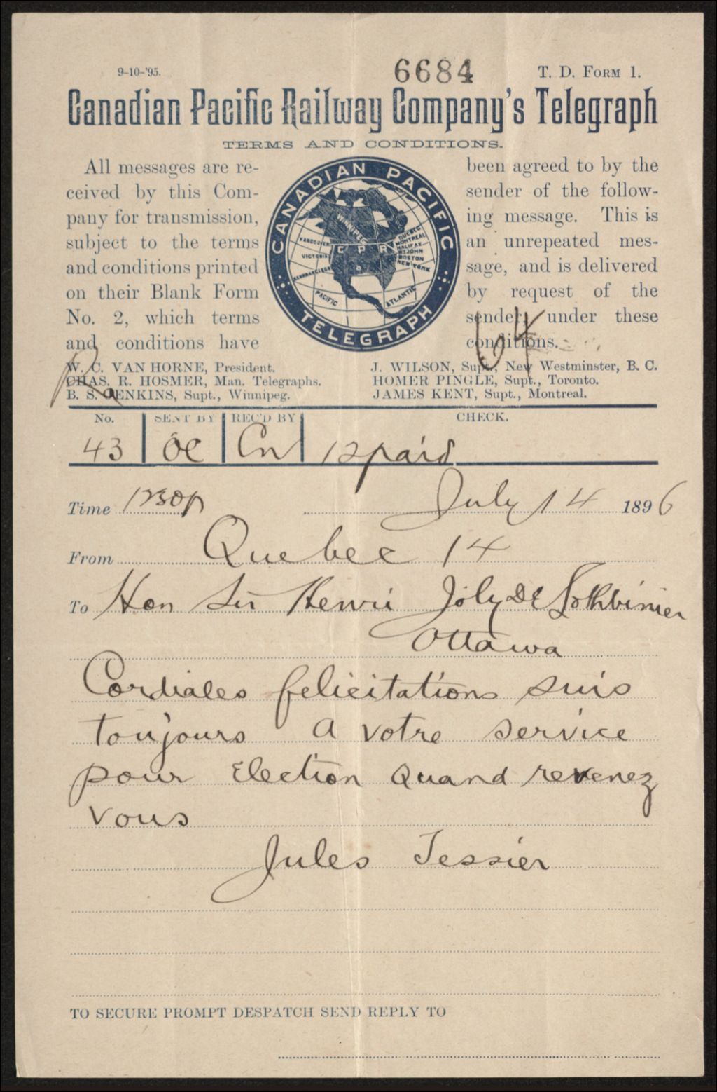 Télégramme de Jules Tessier à Henri-Gustave Joly