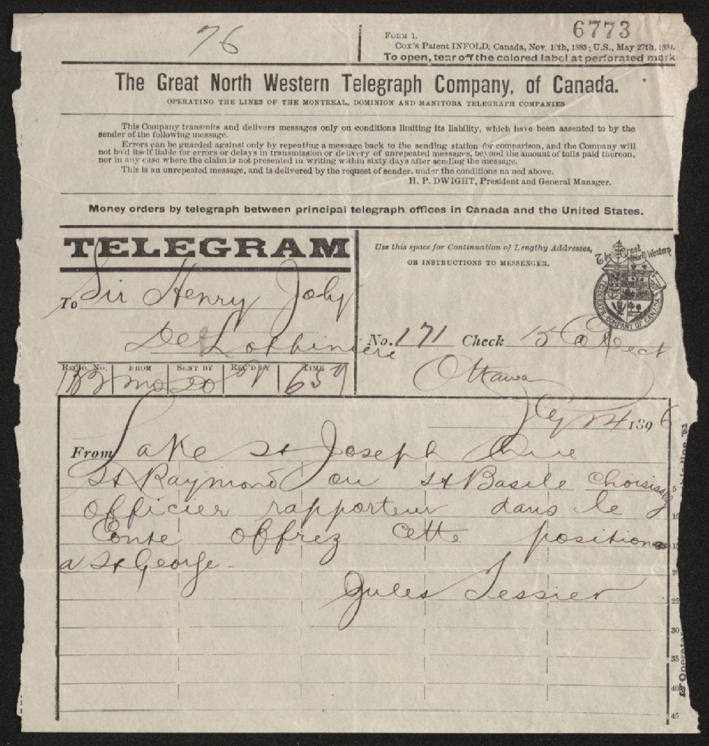 Télégramme de Jules Tessier à Henri-Gustave Joly