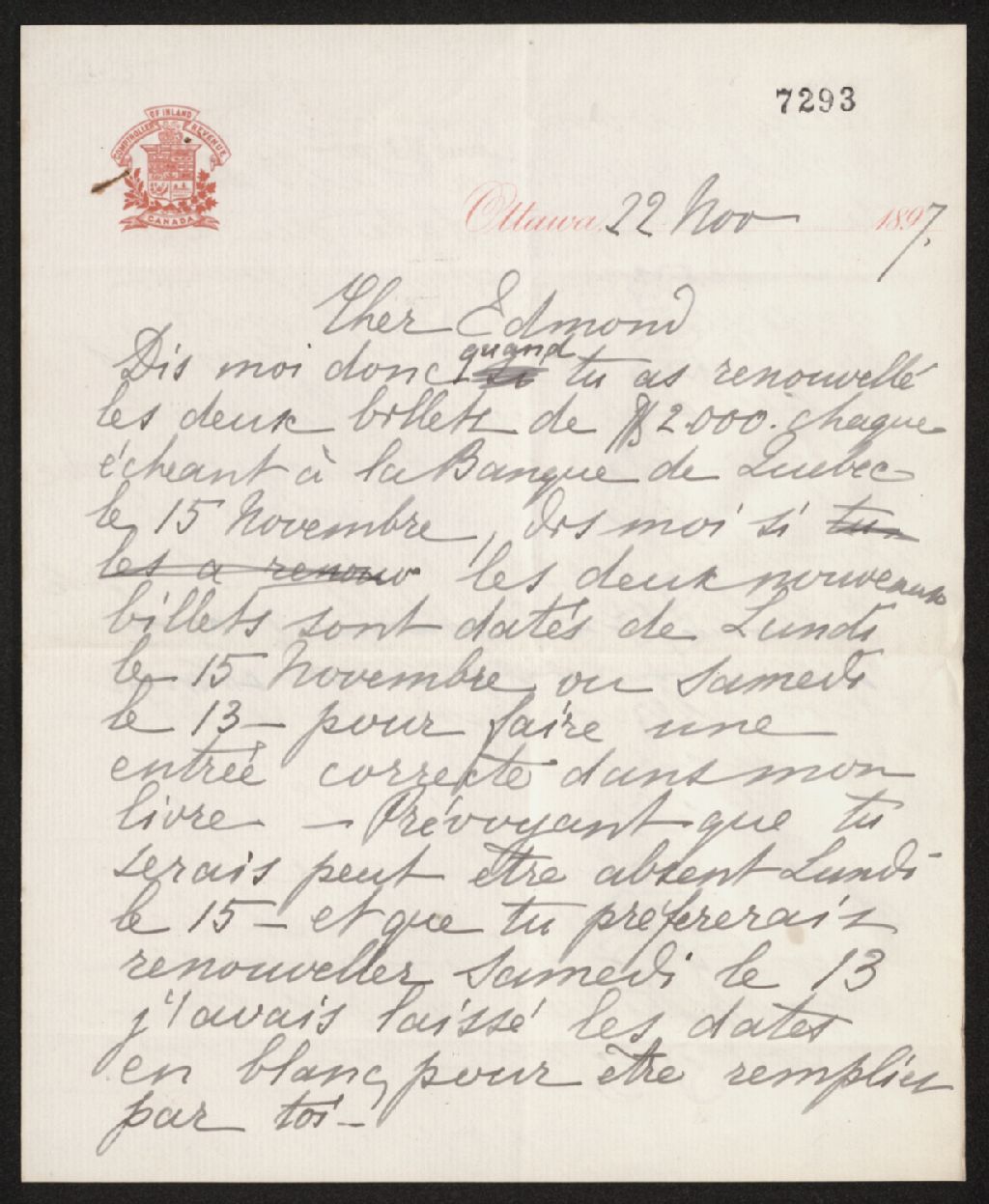 Lettre de Henri-Gustave Joly à son fils Edmond, 22 novembre 1897, Archives nationales à Québec, Fonds Famille Joly de Lotbinière, (03Q,P351,S4,SS1,P7293).