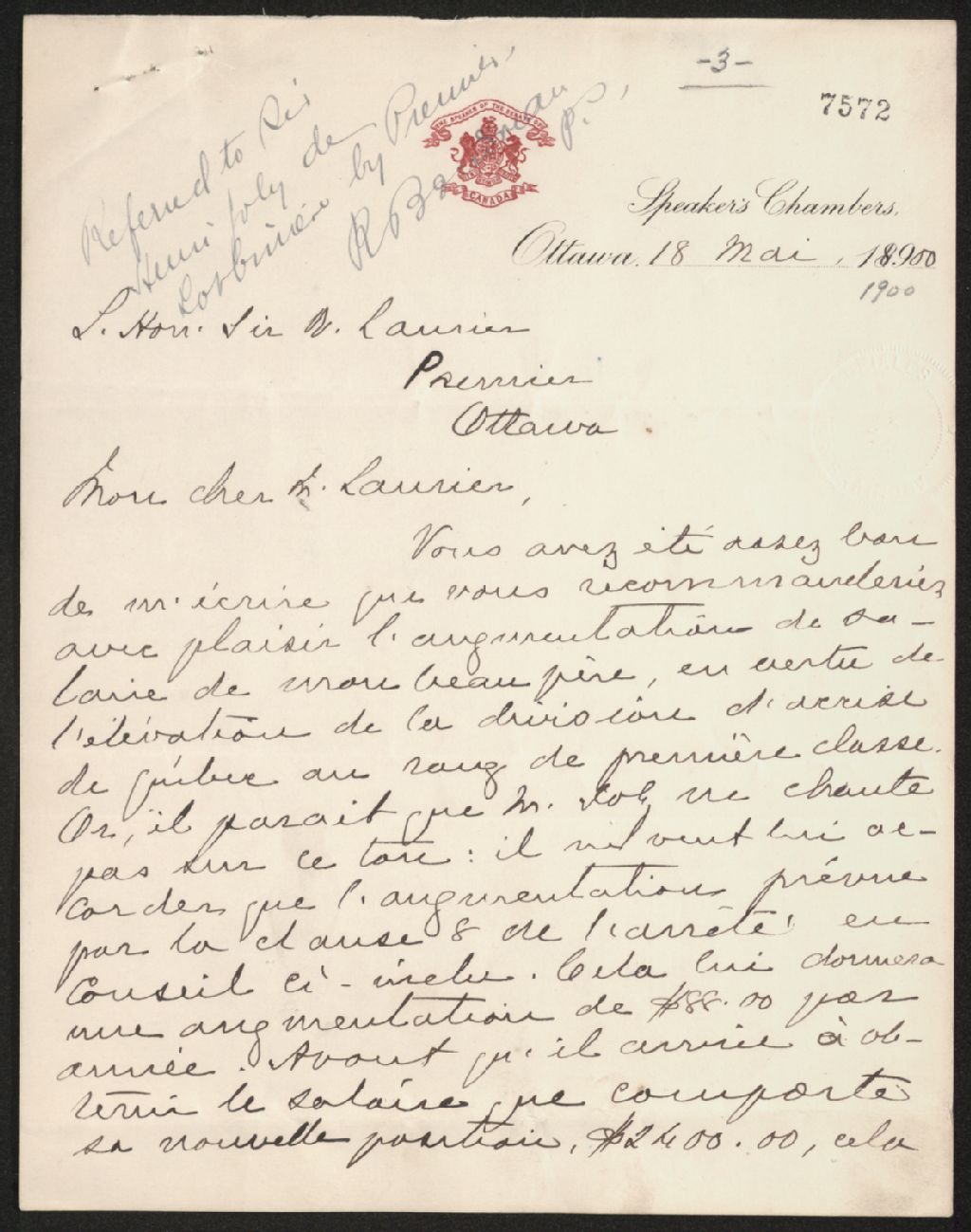 Laurier a été assez bon d'écrire pour recommander l'augmentation de salaire de son beau-père, Larue. Or il paraît que Joly n'est pas du tout d'accord, il ne veut accorder que l'augmentation prévue par la clause de l'arrêté en Conseil. Avant que Larue n'arrive à obtenir le salaire que comporte sa nouvelle position; cela lui prendra cinq ans et il a le temps de mourir dans l'intervalle. Puisqu'on a pu sauter par dessus ce même arrêté en Conseil pour le Docteur Rinfret, il ne voit pas pourquoi on ne ferait pas la même chose pour son beau-père. Demande de dire un mot à Joly. Croit qu'il y aurait moyen de lui faire entendre raison. Joly se laisse influencer par les tories qui l'entourent
