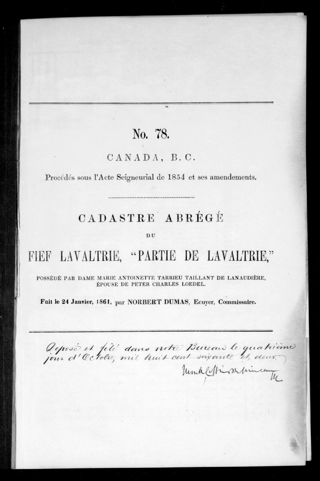 - La propriétaire du fief Lavaltrie, partie de Lavaltrie, est Marie Antoinette Tarrieu Taillant de Lanaudière
