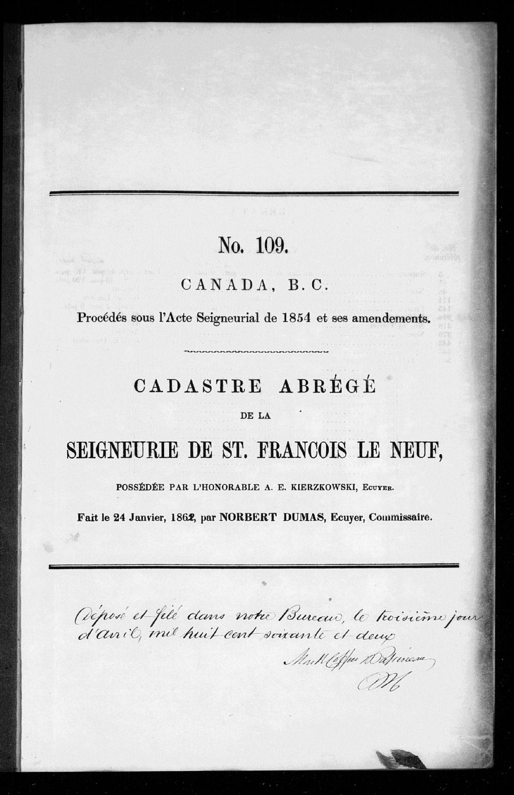 - Le propriétaire de la seigneurie est l'honorable Alexandre-Édouard Kierzkowski