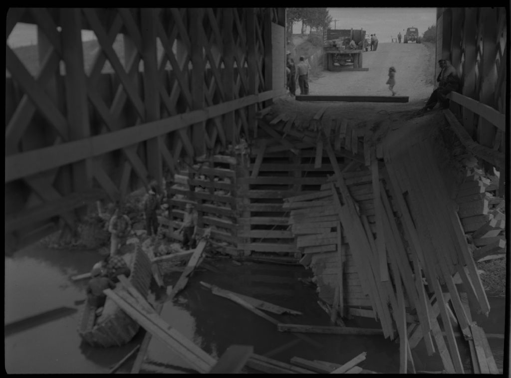 Tablier du pont du ministère de la Voirie enfonce par un tracteur sur la rivière La Flamme à Barraute