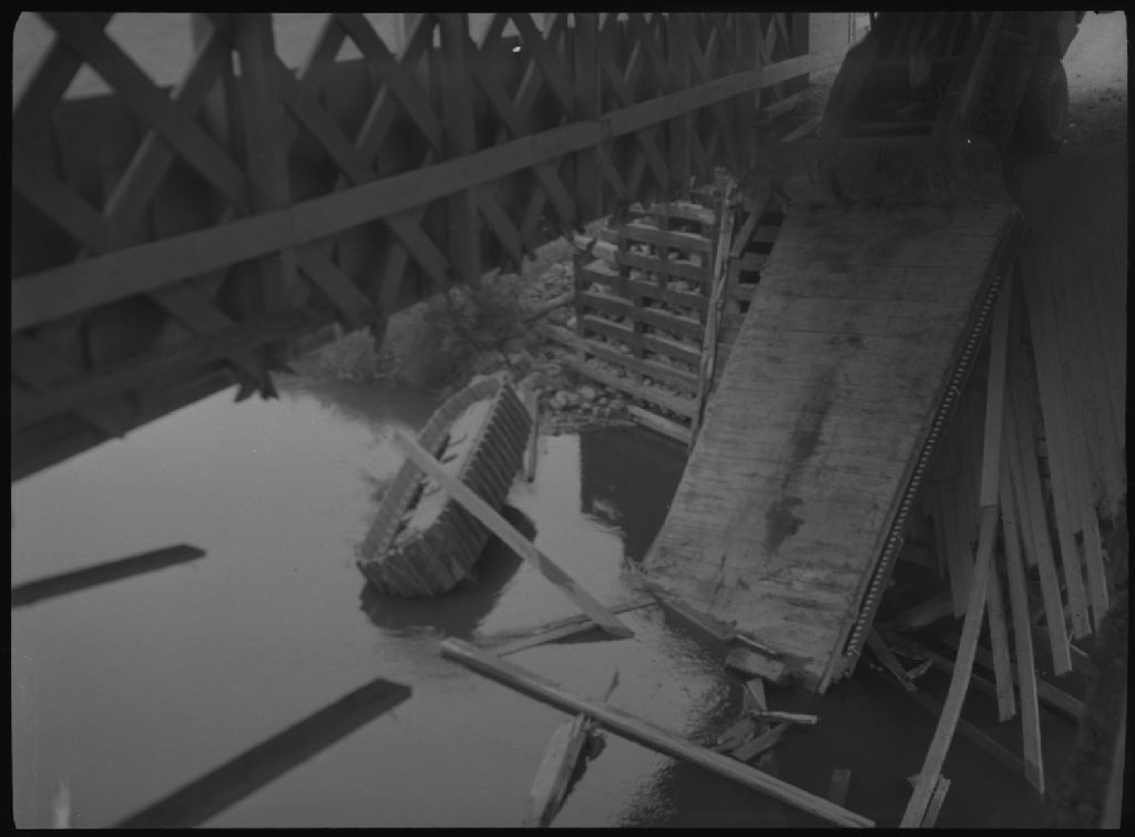 Tablier du pont du ministère de la Voirie enfonce par un tracteur sur la rivière La Flamme à Barraute, 1954, Archives nationales à Québec, Fonds Ministère de la Culture et des Communications, (03Q,E6,S7,SS1,D6,P576-54H), Benoit Dumont.