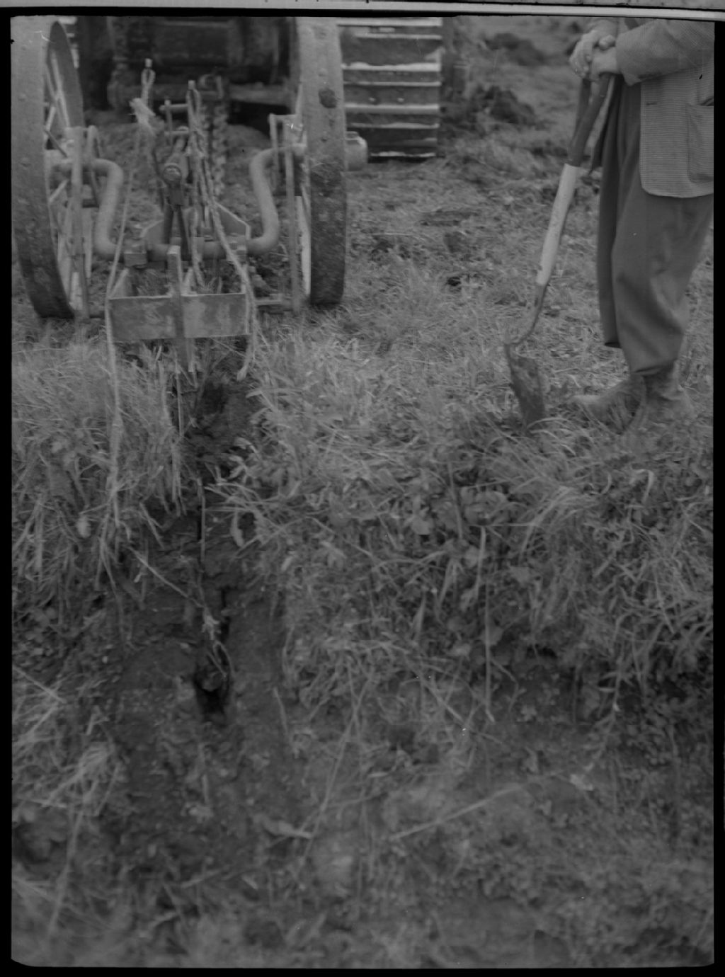 Sous-sarcleuse trainant "obus - taupe" formant un drain à Saint-Maurice, comté d'Abitibi, 1954, Archives nationales à Québec, Fonds Ministère de la Culture et des Communications, (03Q,E6,S7,SS1,D6,P589-54H), Benoit Dumont.