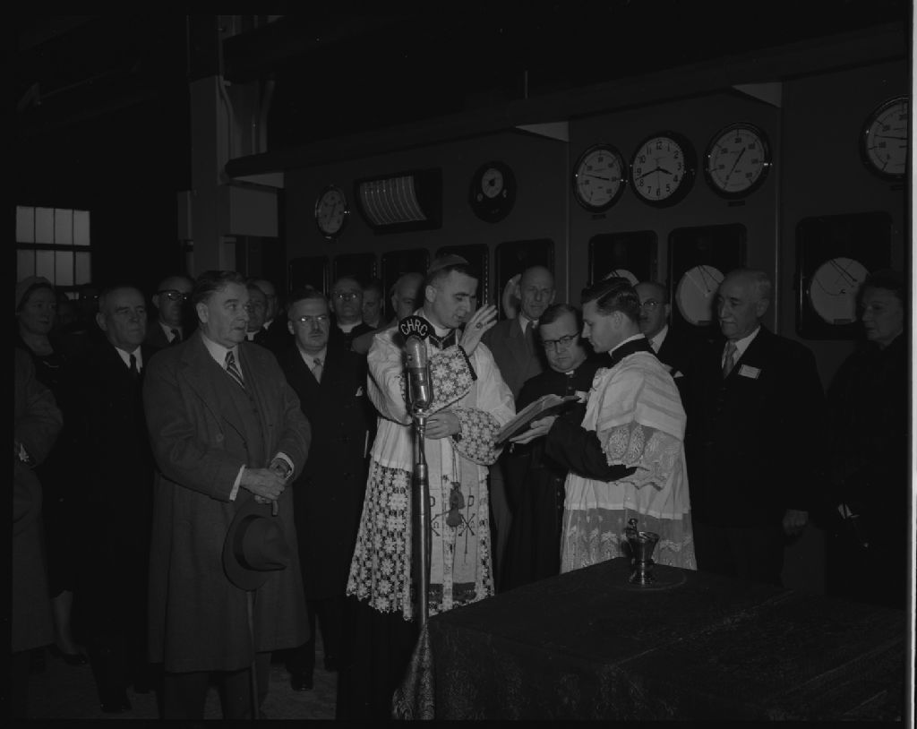 Mgr Maurice Roy bénit la centrale d'énergie de la cité universitaire Laval en présence des représentants officiels de la province, des autorités de l'Université Laval et des officiers de l'Association des anciens de Laval