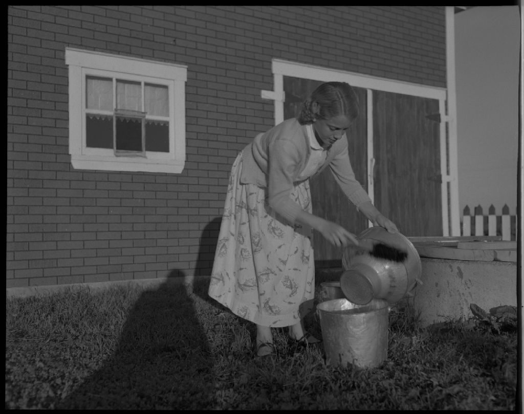 Lauréanne lave le filtre à lait chez Jos. Fortier à Palmarolle, 1954, Archives nationales à Québec, Fonds Ministère de la Culture et des Communications, (03Q,E6,S7,SS1,D6,P1083-54H), Omer Beaudoin.