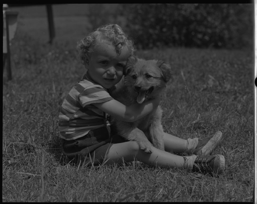 Richard Pichette, petit-fils d'Émile Perreault, avec son chien Finette. Clerval, 1954, Archives nationales à Québec, Fonds Ministère de la Culture et des Communications, (03Q,E6,S7,SS1,D6,P1093-54H), Omer Beaudoin.