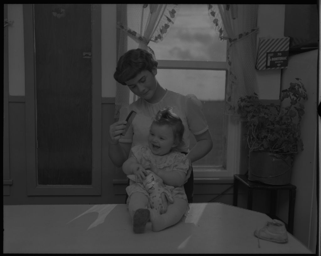 Fernande peigne bébé Nicole chez Antoine Lévesque à Saint-Léonard, Matapédia