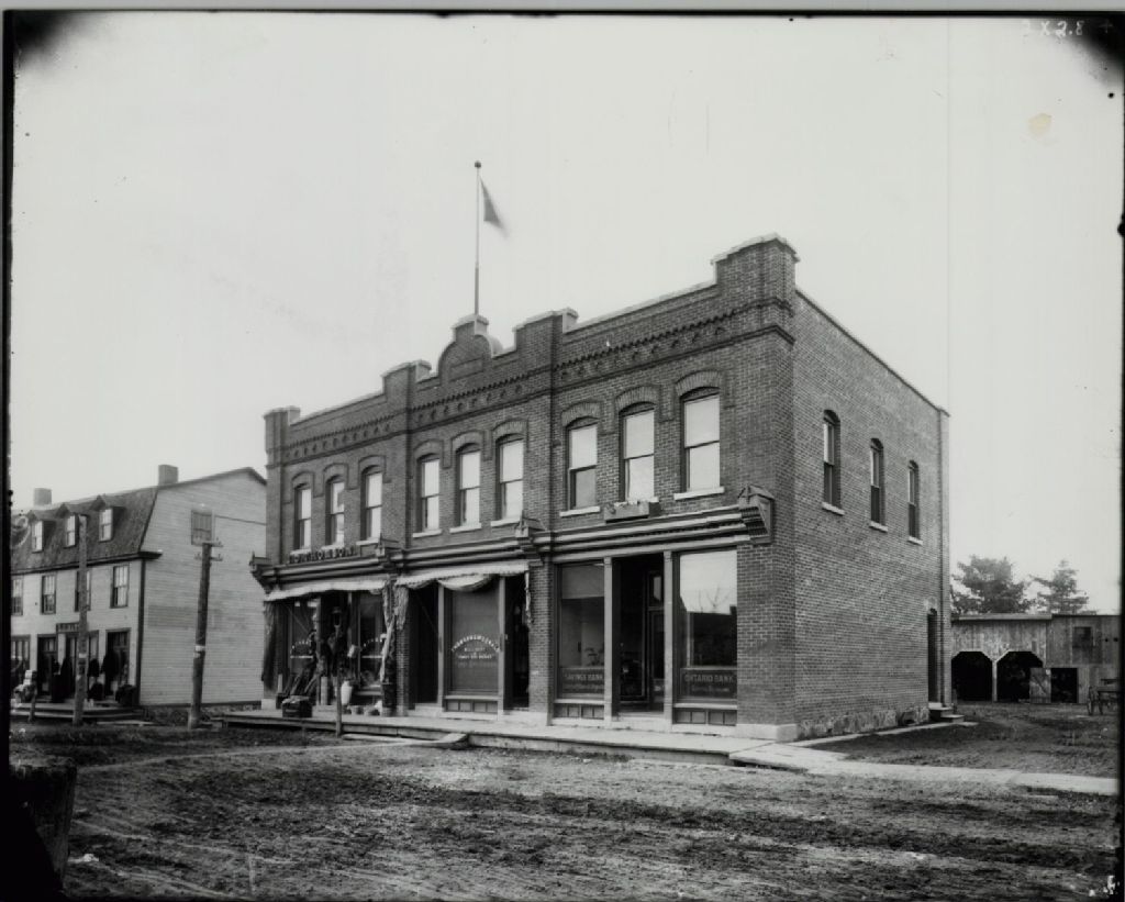 Le "Thomson Block" est occupé par l'épicier J.D. Thomson à gauche, le marchand général "Thomson & McDonald" au centre, puis la Ontario Savings Bank à droite. À noter les trottoirs de bois et la maison de bois avec lucarnes à gauche