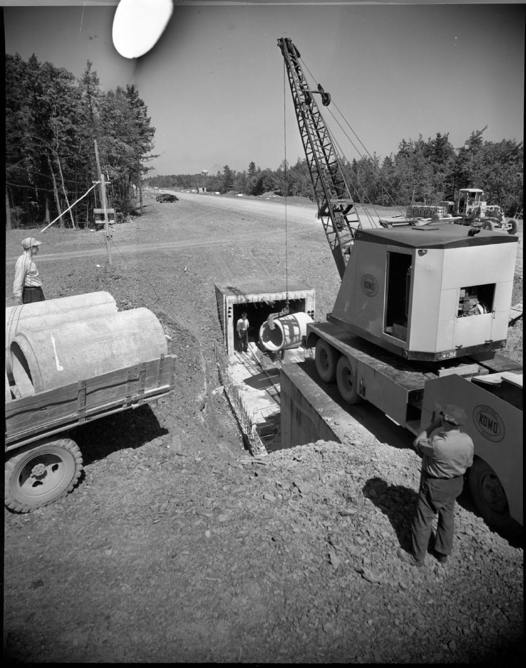 [Grue installant des tuyaux], 1950, Archives nationales à Québec, Fonds Ministère de la Culture et des Communications, (03Q,E6,S7,SS1,D2591,P301-50-8D), Georges A. Driscoll.