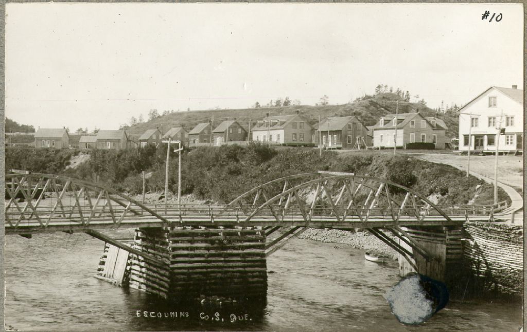 Rivière des Escoumins - Saint-Marcellin des Escoumins - Pont, magasin et quelques maisons appartenant à la Saguenay Lumber Co.
