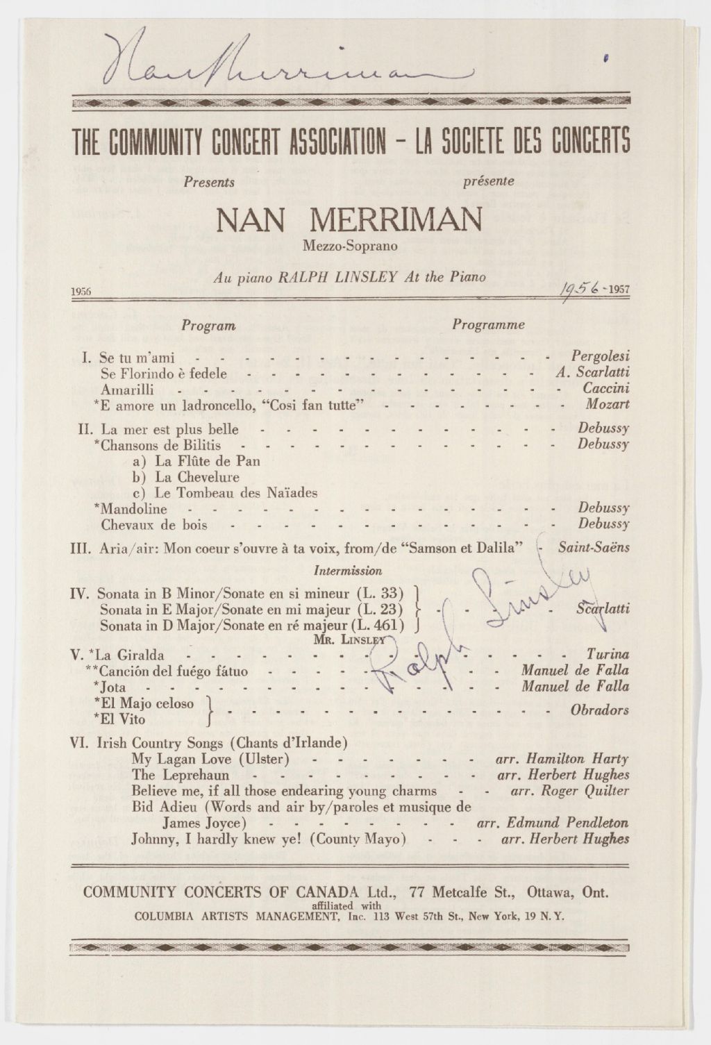 - Programme de la société des concerts de Chicoutimi. Autographié par la chanteuse Mezzo-soprano Nan Merriman et le pianiste Ralph Linsley