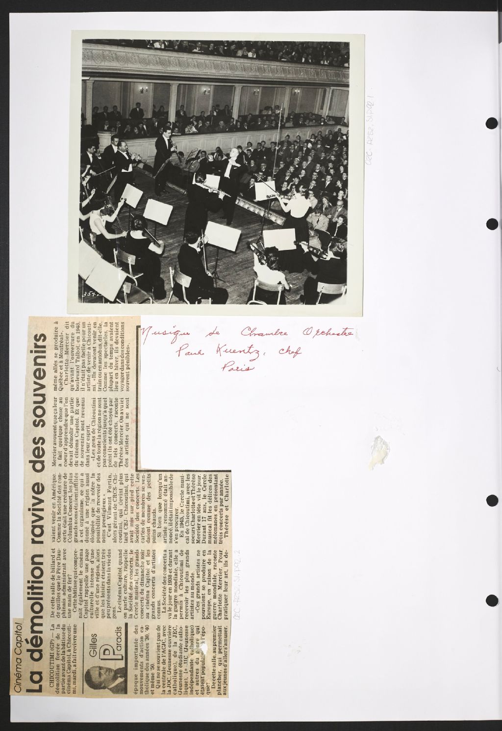 Photographie de musique d'orchestre de chambre de Paris, 1965, Archives nationales à Saguenay, Gabrielle Gaudreault, (02C,P252,D1,P92.1), Photographe non identifié.