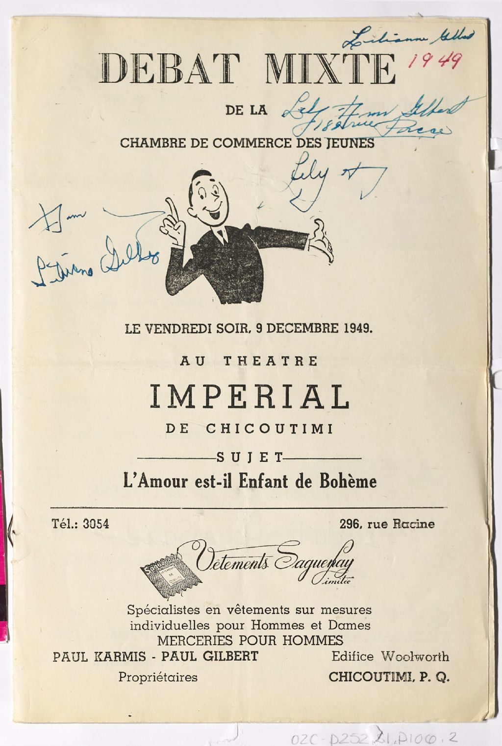 - Programme du Débat mixte de la chambre des commerces des jeunes. Signatures de Lilyanne Gilbert