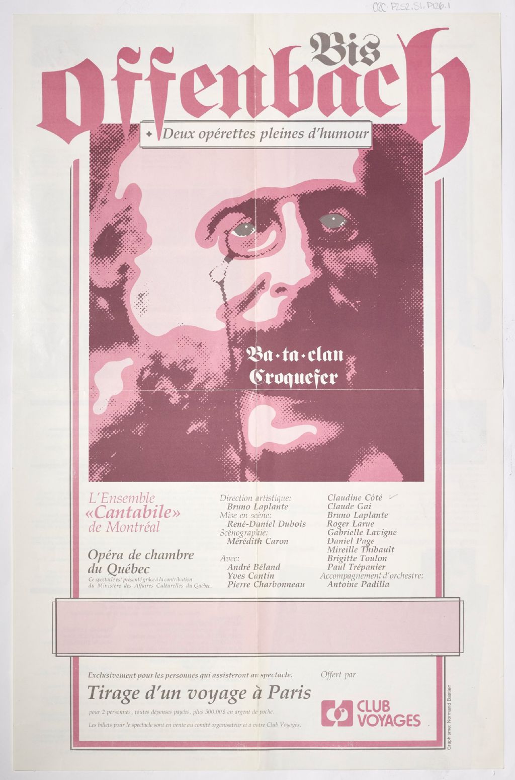 Affiche annonçant les deux opérettes de Jacques Offenbach, Ba-ta-clan et Croquefer. Le programme des deux opérettes se trouve à l¿endos. Les opérettes sont interprétées par l'Ensemble Cantabile de Montréal et l'Opéra de chambre du Québec
