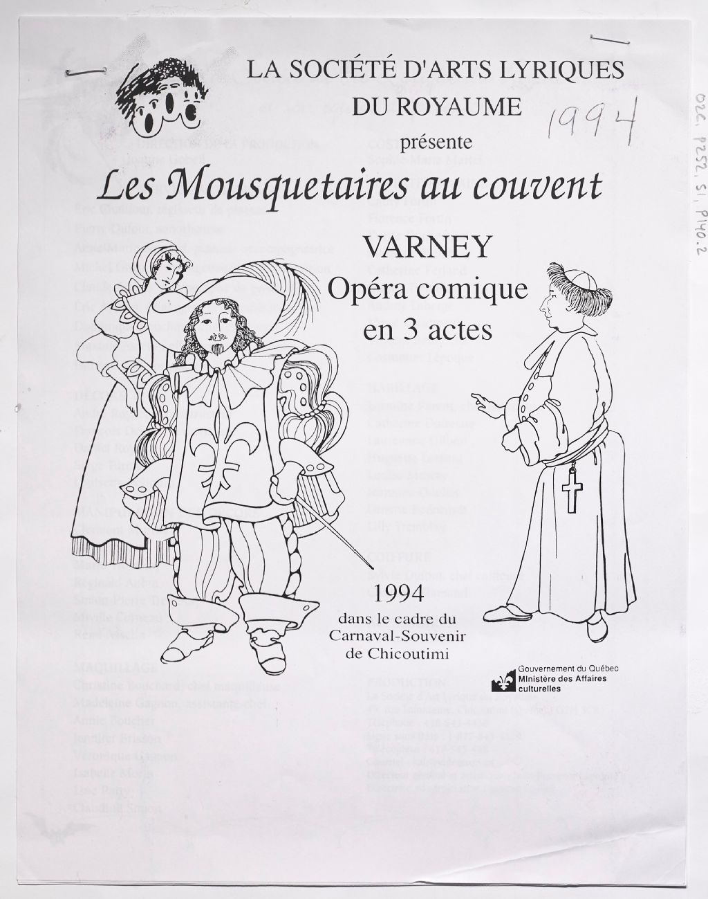 - Programme Les Mousquetaires au Couvent opéra comique de Varney, présenté par la Société d'art lyrique du Royaume dans le cadre du Carnaval-Souvenir de Chicoutimi