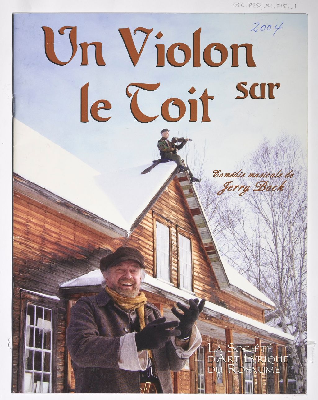 Programme Un Violon sur le Toit de Jerry Boch, comédie musicale mise en scène par Éric Chalifour, Gilles Auger direction musicale, présenté par la Société d'art lyrique du Royaume à l'Auditorium Dufour en avril et mai 2004