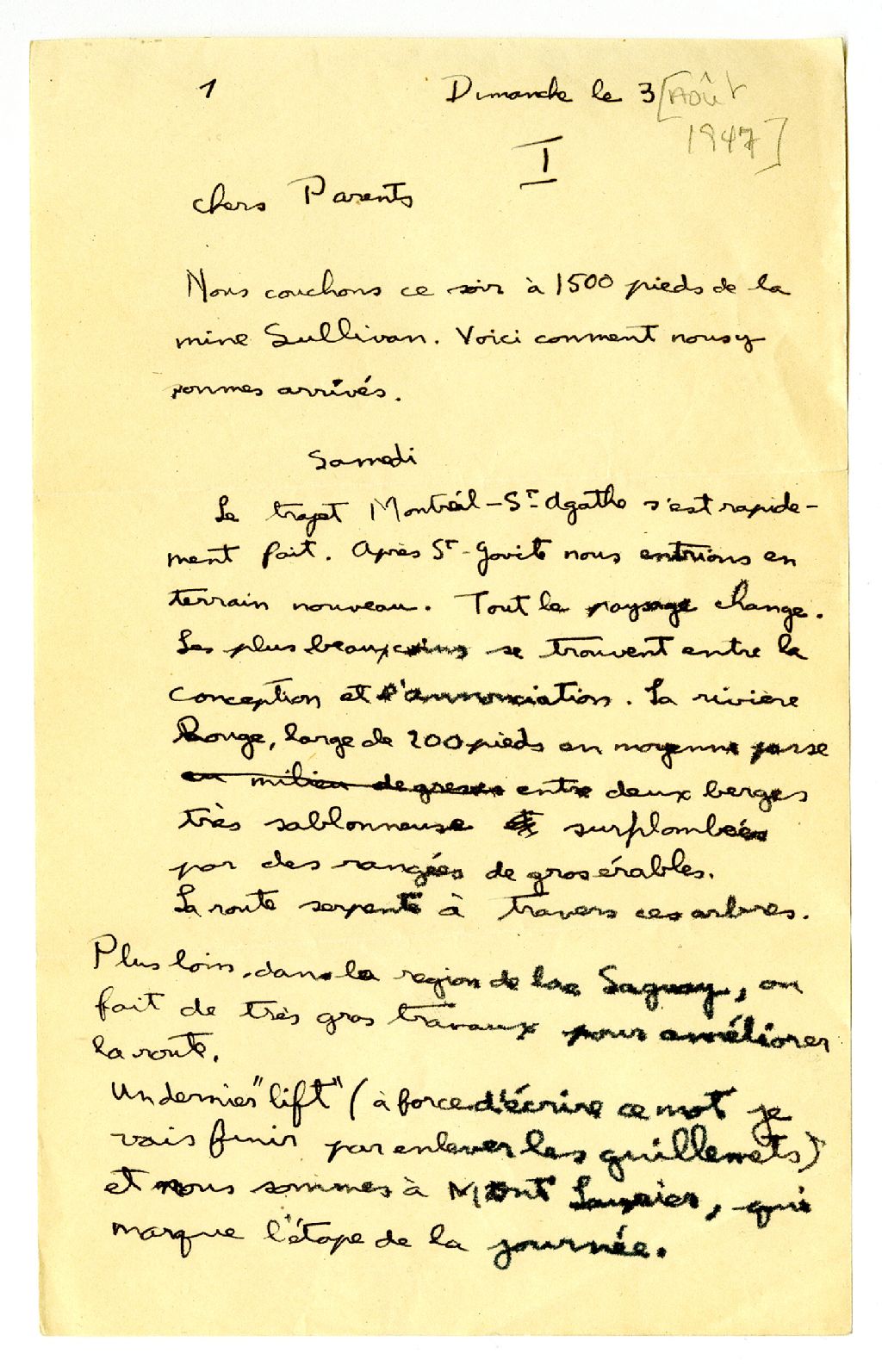 Cette pièce comprend des lettres, sous forme d'un journal de voyage, de Jacques Parizeau à ses parents. Elles proviennent de l'Abitibi et du nord de l¿Ontario (1947), régions visitées par Jacques Parizeau en compagnie de son frère Michel qui signe également les lettres