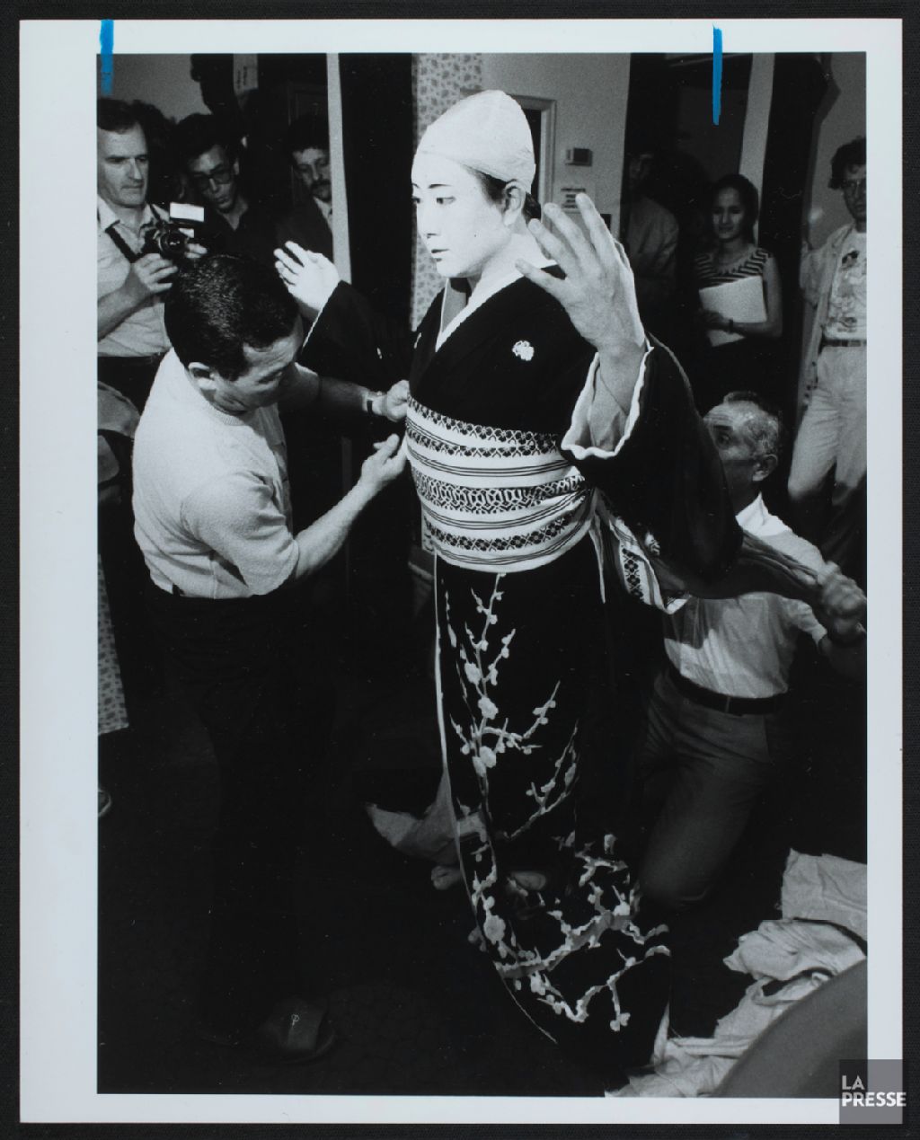 - Les photographies illustrent un acteur japonais se maquillant avant d¿entrer en scène, appelé onnagata, désignant un homme qui interprète un rôle féminin pour exprimer de manière stylisée le c¿ur de la femme