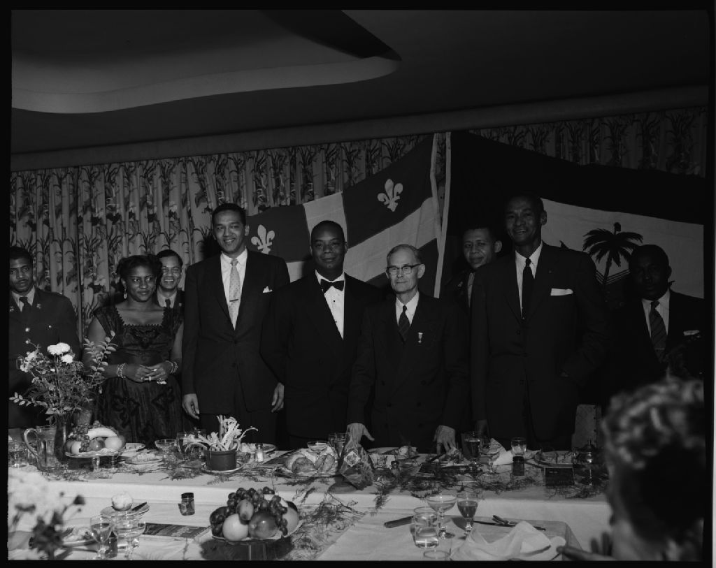 Groupe officiel d'Haiti réuni à l'occasion de la visite du Président Paul Eugène Magloire à Québec, 1955, Archives nationales à Québec, Fonds Ministère de la Culture et des Communications, (03Q,E6,S7,SS1,D2474,P153-55H), Neuville Bazin.