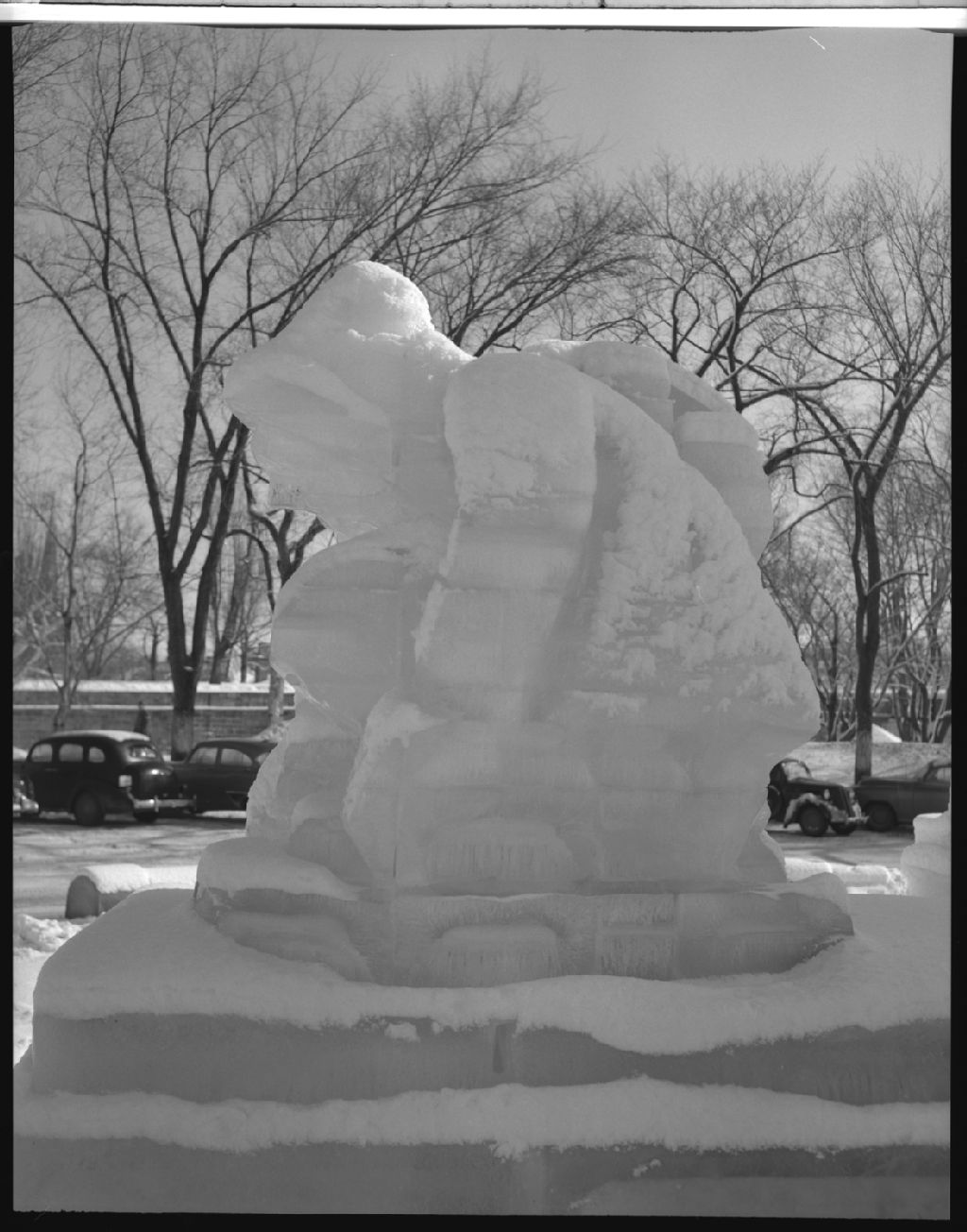 "Coureur des bois, le loup-garou" détail du monument sculté dans la glace au rond-point en face du Parlement lors du carnaval de Québec
