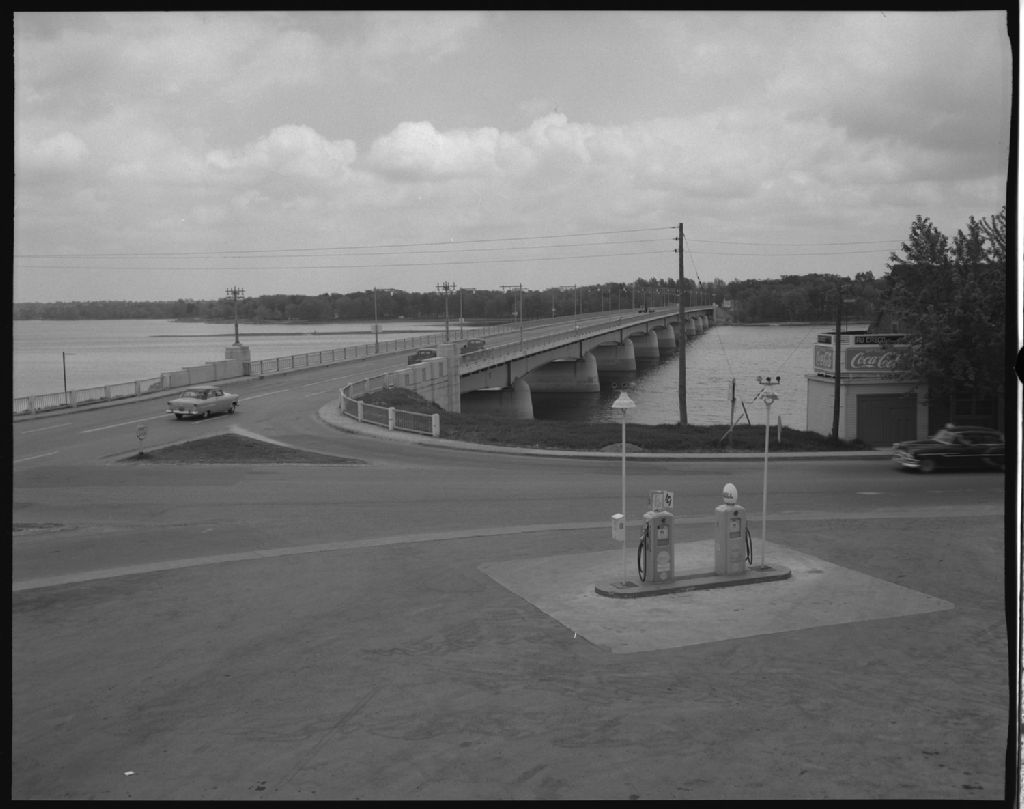 Pont Bellefeuille ou Arthur-Sauvé traversant la rivière des Milles-ÎLes à Saint-Eustache, 1955, Archives nationales à Québec, Fonds Ministère de la Culture et des Communications, (03Q,E6,S7,SS1,D7,P652-55H), Paul Carpentier.