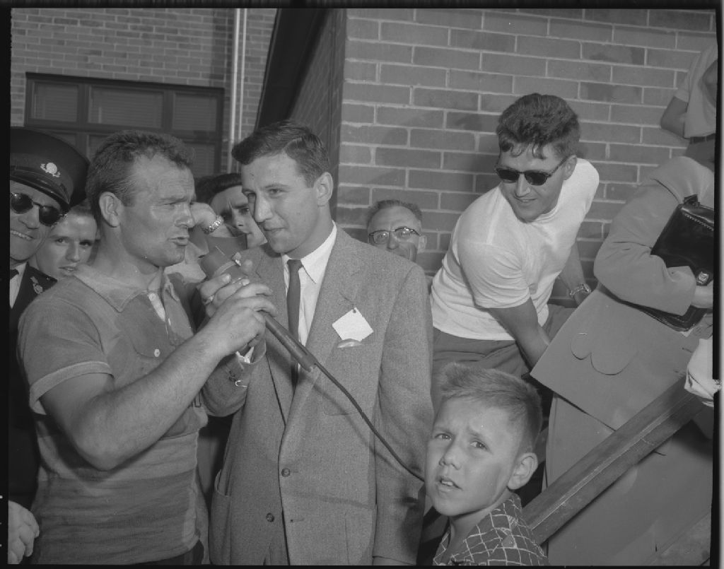 Yvon Guillou, organisateur du Tour du Saint-Laurent cycliste, interviewé par B. Thibault annonceur à C.H.R.C. chez Dumais Ltée, Québec, 1955, Archives nationales à Québec, Fonds Ministère de la Culture et des Communications, (03Q,E6,S7,SS1,D2630,P1660-55H), Neuville Bazin.