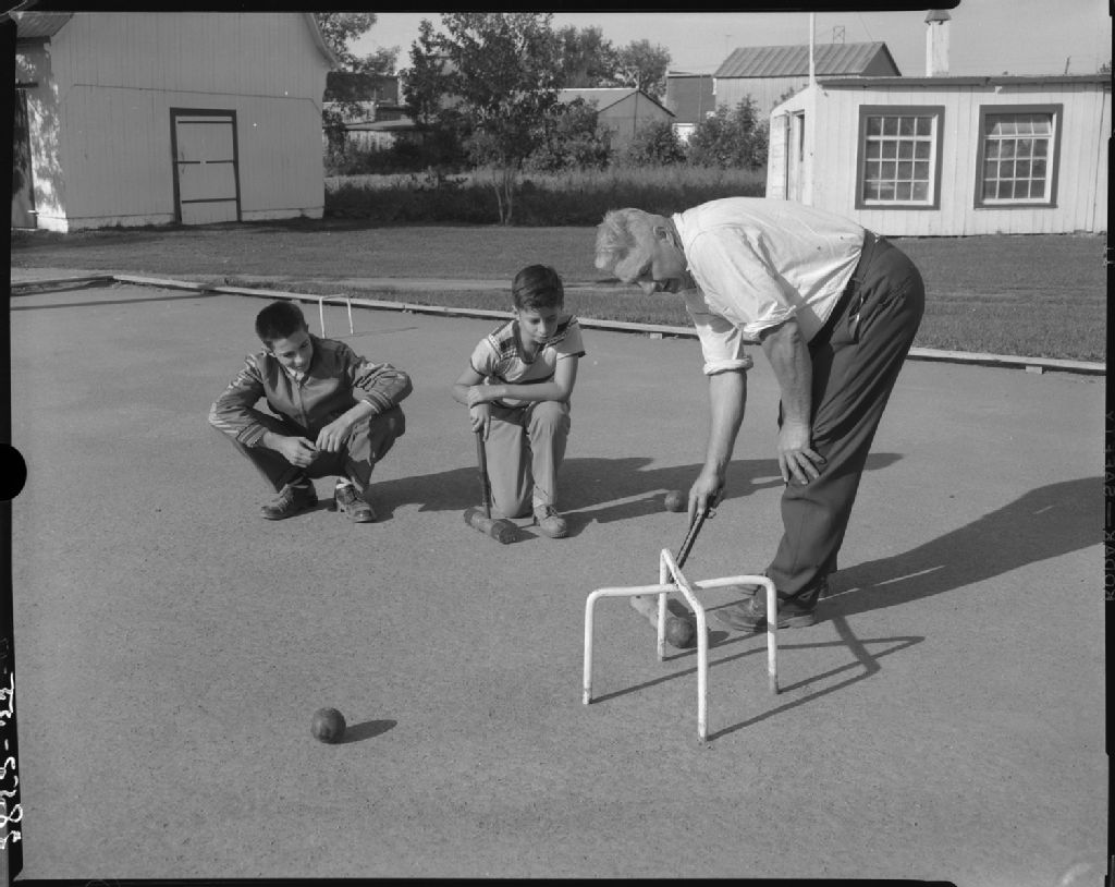 Jeu de croquet devant la grange chez Adrien Gervais à Sainte-Martine, comté de Châteauguay, 1955, Archives nationales à Québec, Fonds Ministère de la Culture et des Communications, (03Q,E6,S7,SS1,D7,P2852-55H), Omer Beaudoin.