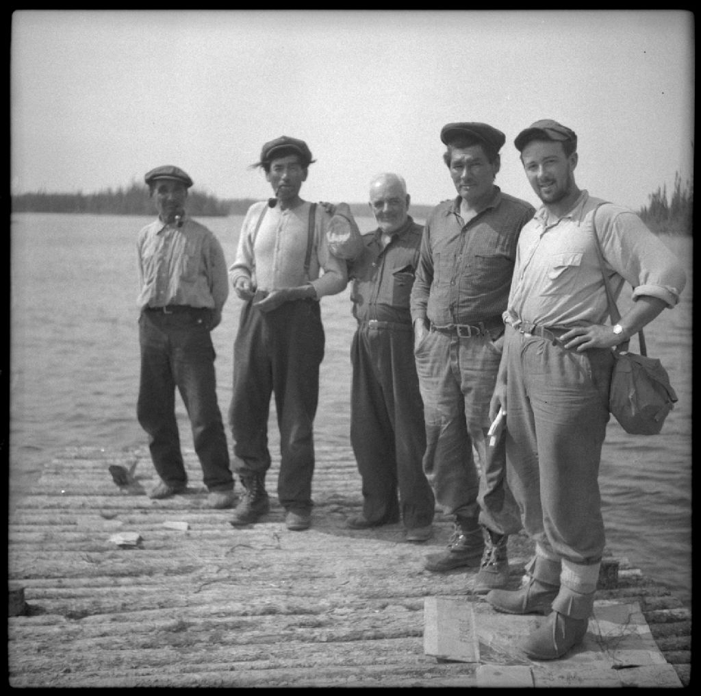 Trois autochtones cris de la communauté de Mistissini (anciennement Mistassini Post), un guide, et Paul-Yves Denis, assistant à la tête de la rivière Rupert. Baie-James