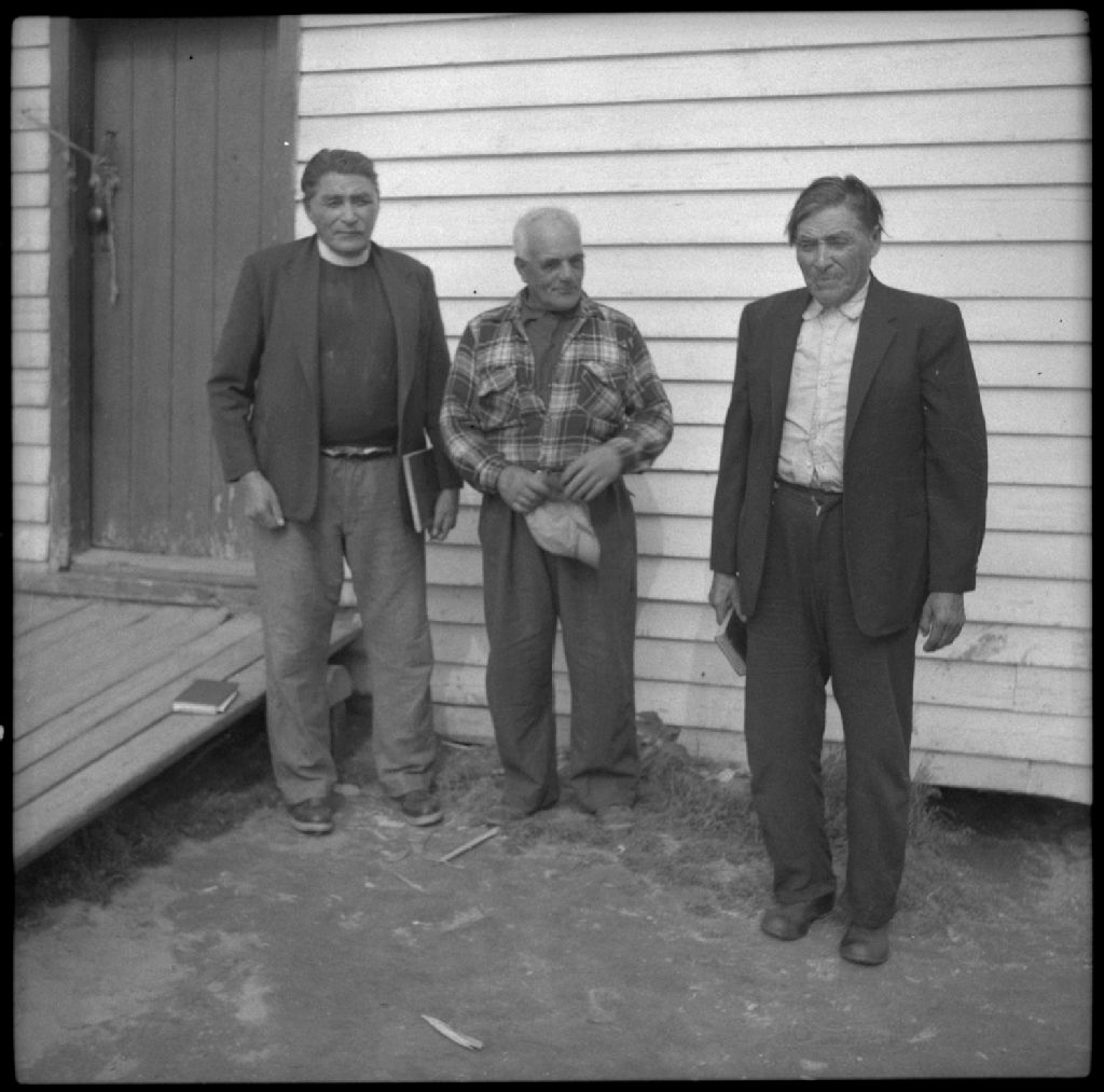 Les deux diacres autochtones de la communauté crie de Mistissini et un des aides du groupe de géographie, Jos. Gagnon de Val-Jalbert, à la communauté crie de Mistissini (anciennement Mistassini Post)
