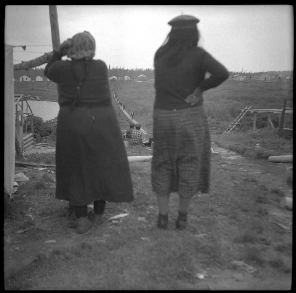 Deux autochtones regardant vers la chapelle pour un mariage à la communauté crie de Mistissini