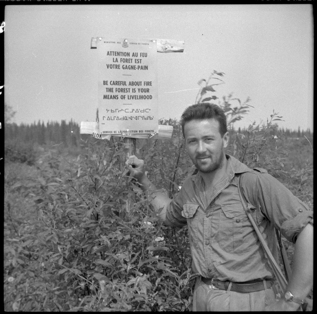 L'assistant du groupe de géographie Paul-Yves Denis se tient près d'une affiche en trois langues invitant à la prudence des voyageurs en forêt. Communauté crie de Mistissini, 1955, Archives nationales à Québec, Fonds Ministère de la Culture et des Communications, (03Q,E6,S7,SS1,D7,P3254-55H), Camille Laverdière.