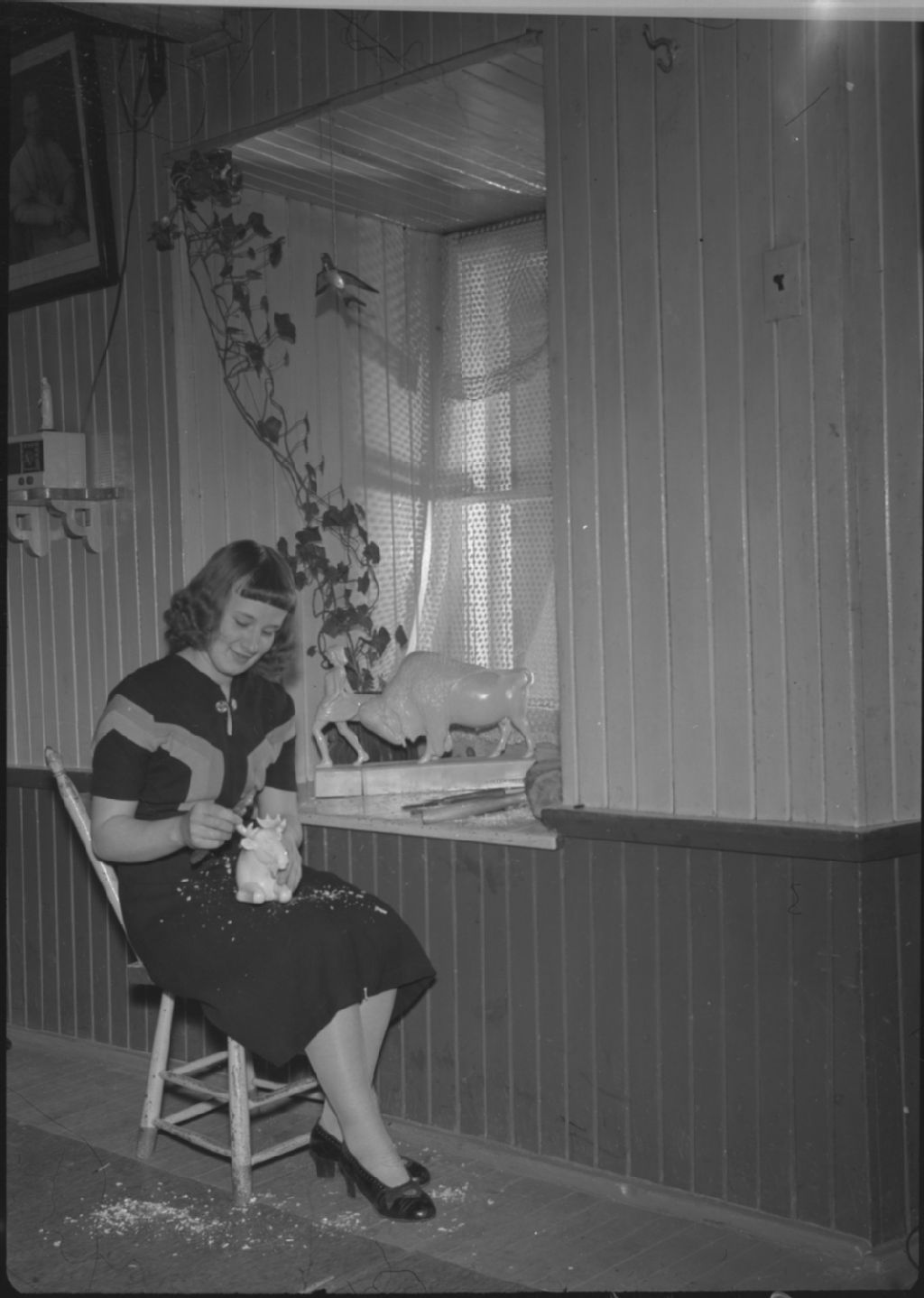 - 1. Jeune femme qui sculpte un orignal en pierre2. Homme qui sculpte un personnage en pierre
