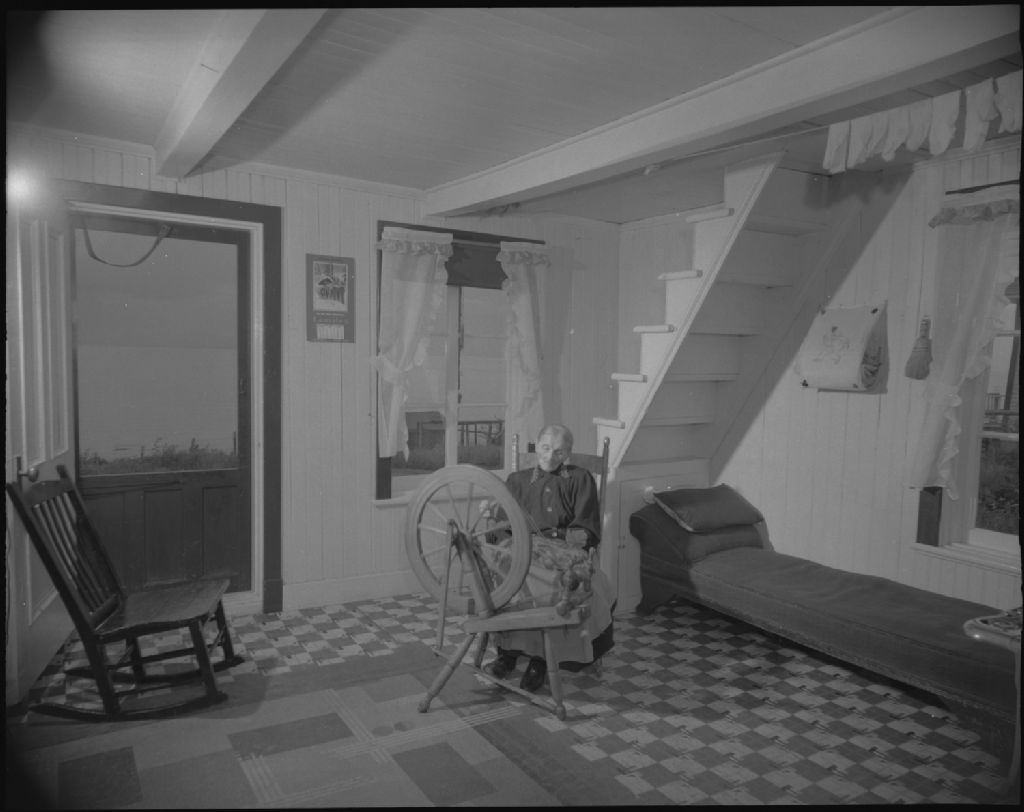 Vieille femme au rouet dans une maison de l'Île-aux-Coudres, région de Charlevoix.