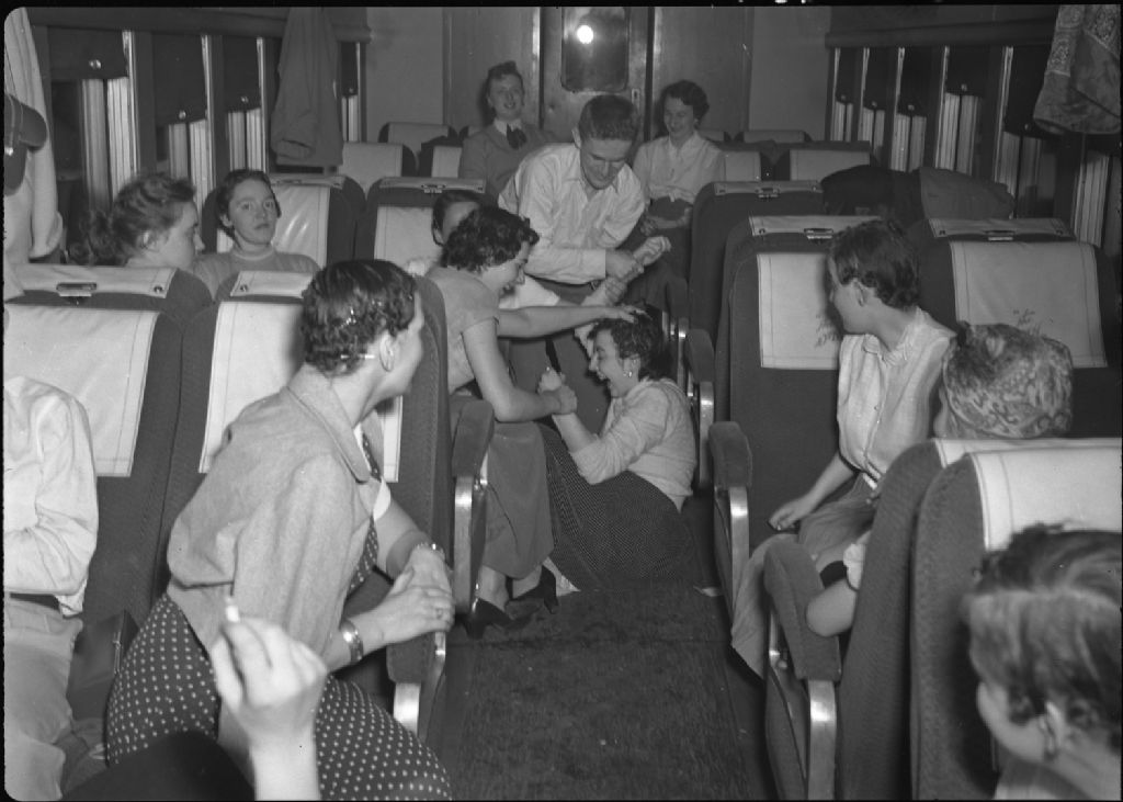 Groupe d'étudiants féminines de l'institut Driscoll dans le train lors d'un voyage à New York