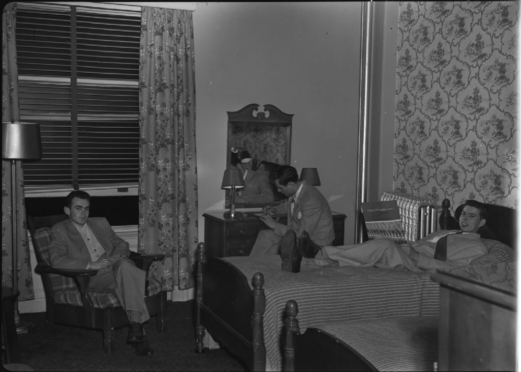 Groupe d'étudiants de l'institut Driscoll dans une chambre d'hôtel lors d'un voyage à New York, Vers 1955, Archives nationales à Québec, Fonds George A. Driscoll, (03Q,P630,S6,D108), George A. Driscoll.