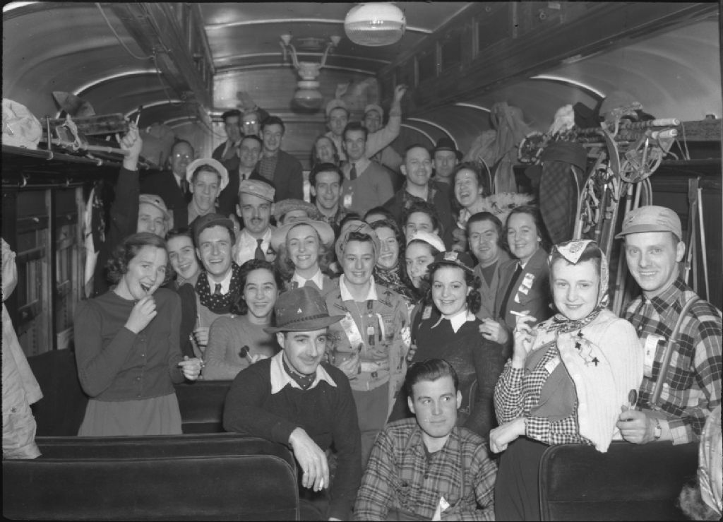 Joyeux skieurs dans un train, Vallée-Jonction, Vers 1950, Archives nationales à Québec, Fonds George A. Driscoll, (03Q,P630,S6,D73851), George A. Driscoll.