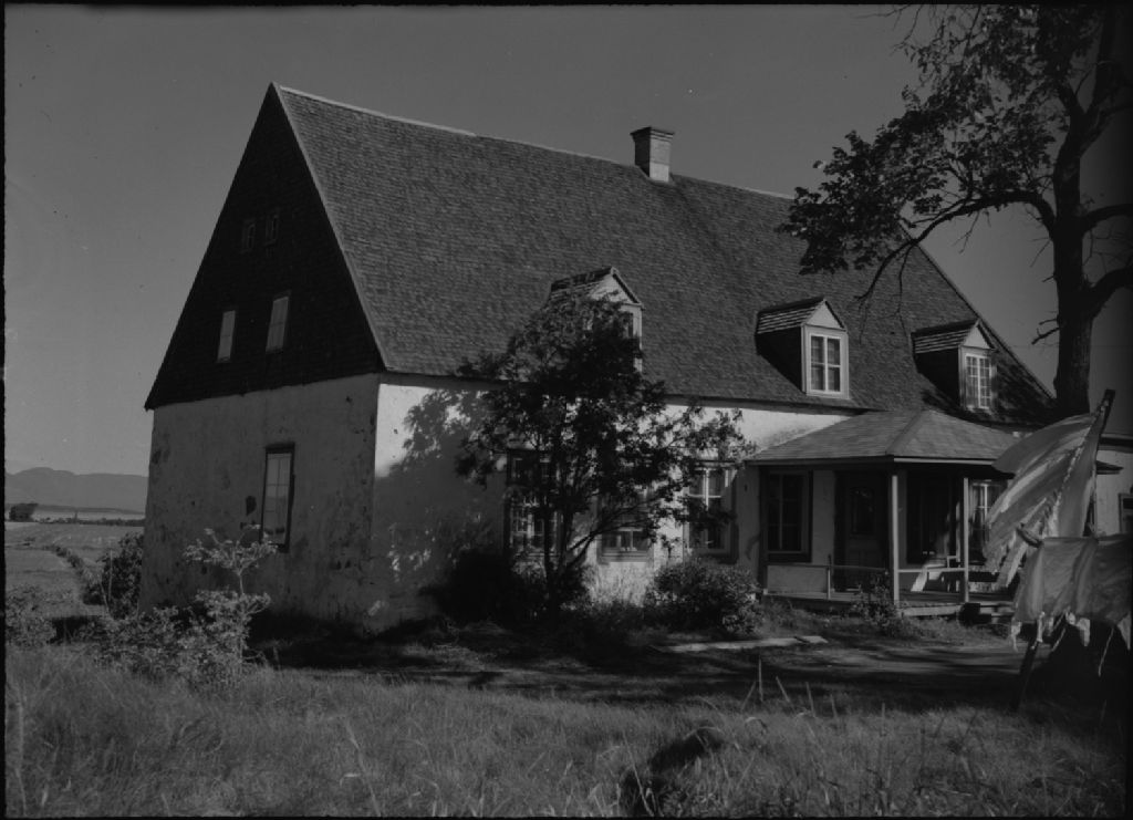 Vieille maison de ferme en pierre. Gros plan. Arbres devant la maison. Corde à linge. Île-aux-Grues. Montmagny