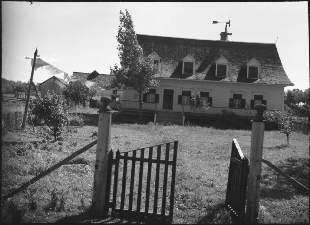 Grande ferme et dépendances. Corde à linge. Barrière ouverte devant la maison. Île-aux-Grues