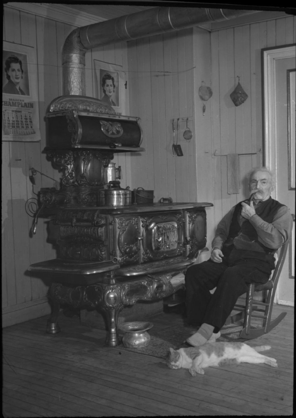 L'homme le plus âgé de Saint-Pierre fumant la pipe devant son poêle avec son chat. Île d'Orléans, Vers 1950, Archives nationales à Québec, Fonds George A. Driscoll, (03Q,P630,S11,D14651), George A. Driscoll.