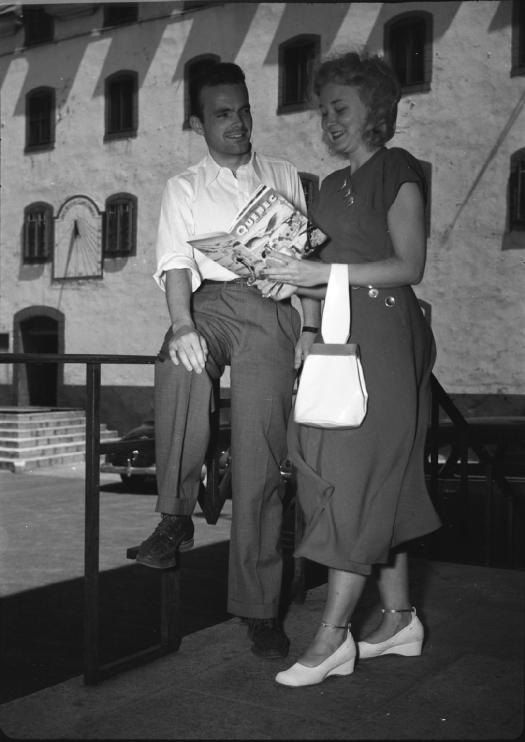 Couple devant le cadran solaire de l'Université Laval, Québec., Vers 1950, Archives nationales à Québec, Fonds George A. Driscoll, (03Q,P630,S11,D47449), George A. Driscoll.