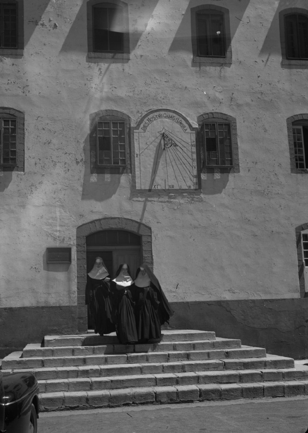 Religieuses sortant de l'Université Laval, sous le cadran solaire. Québec